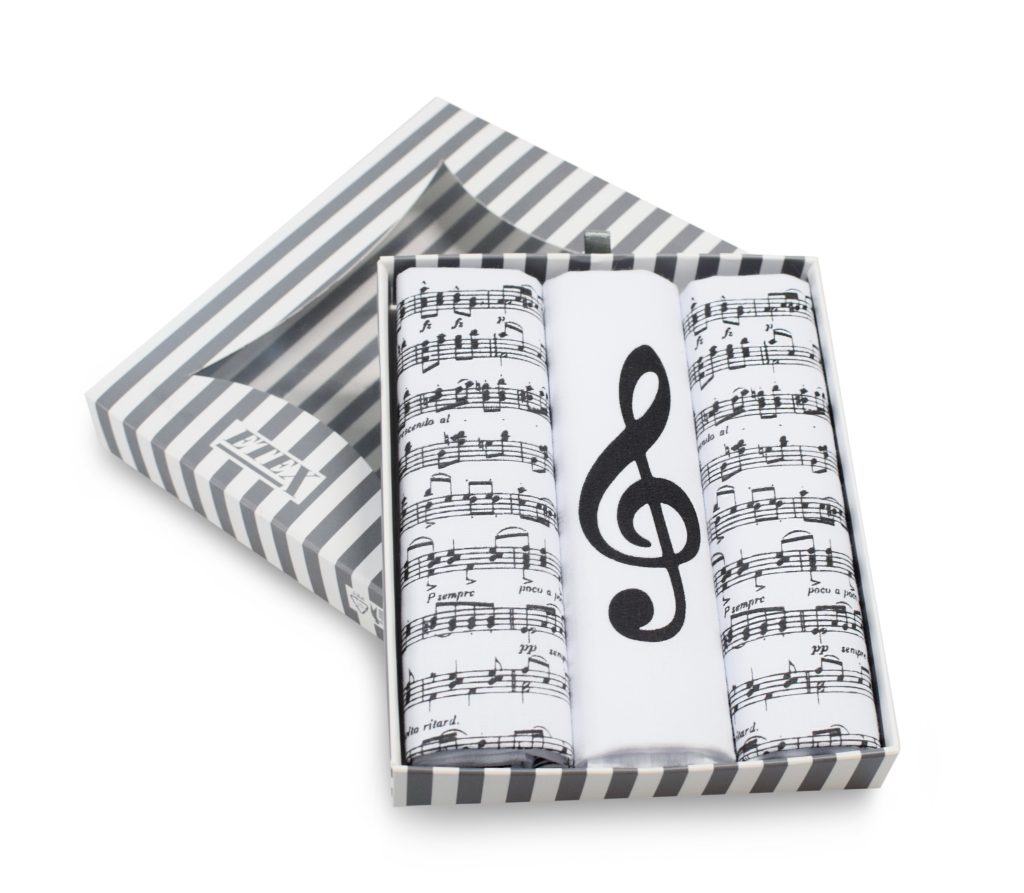 3 db 40cm x 40cm fehér zsebkendő, nyomott kotta mintával.